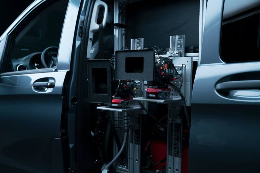 Christopher Probst: 2 side-mounted cameras out each side door correspond to front over-the-shoulder and French over angels predetermined by Fincher on a picture car line-up day where precise measurements for each period car we aligned and taken. On the Modern sliders I custom designed adhesive ruler decals that were measured relative to a perfectly flat floor standard with the vehicle weighted for 5 passengers, guaranteeing that the heights were accurate to our picture vehicle measurements. With the Modern sliders, 3 knurled knobs allowed for height adjustments to be made in about 15 seconds for each camera. The tilt plates were engraved with up to 30-degrees of tilt measurements, and could also be adjusted in a manner of seconds…