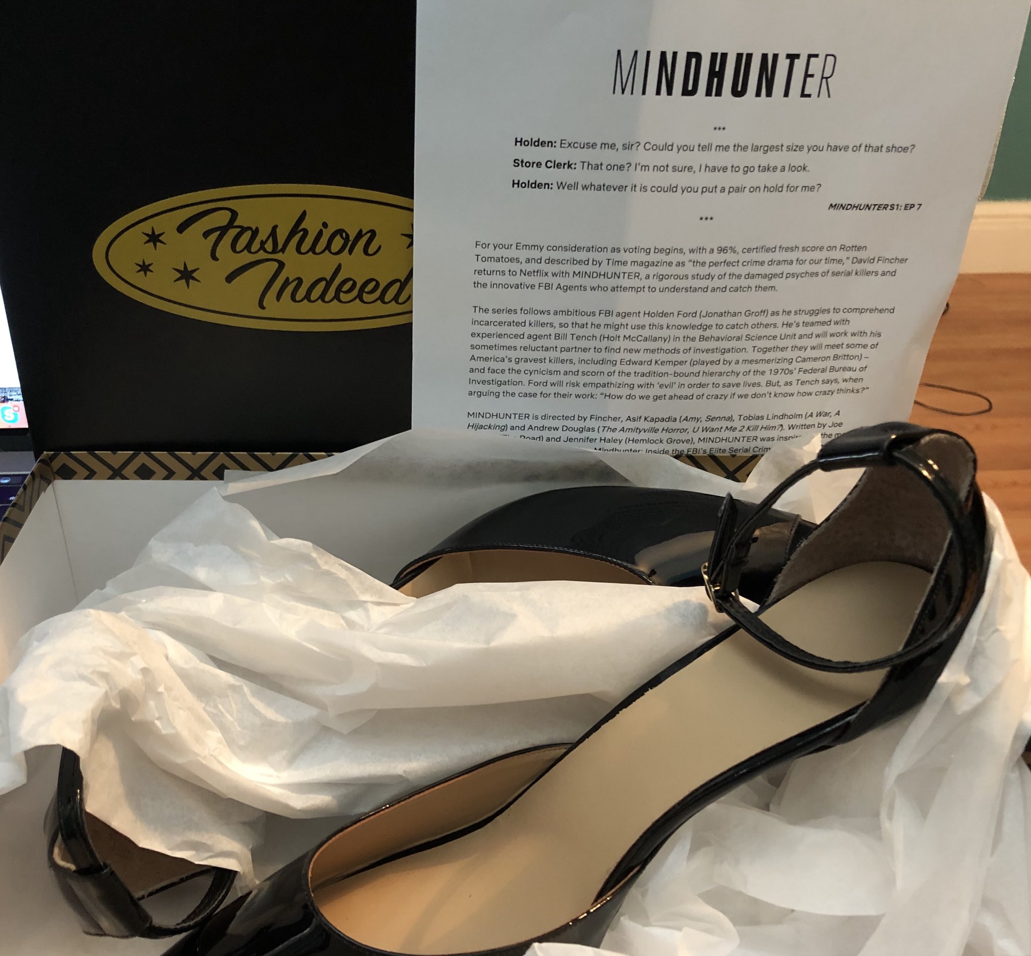 Previous Image Next Image 2018-06-12. Chris Evangelista (Twitter) – Netflix sent me a pair of high heels as part of the #Mindhunter Emmy campaign High Heels in a Shoe Box 02 (Chris Evangelista, Twitter)