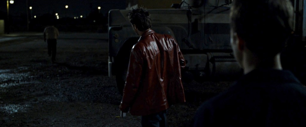 The Fight Club equivalent is the “human sacrifice” scene. Tyler pulls Raymond K. Hessel out from a convenience store, puts him on his knees and tells him, “Raymond! You are going to die!” (while pointing a gun at the back of his head). Raymond is beside himself with fear, shaking, begging and crying as Tyler taunts him about his sad life and how he needs to sort it out [6]. In the book, Tyler specifically mocks Raymond for his self-pity: