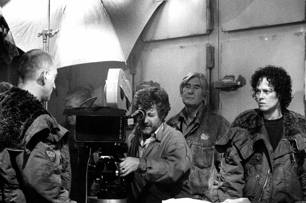 Behind the camera, Alex Thomson, BSC watches intently as operator David Worley lines up a shot on Charles Dance as Sigorney Weaver stands by.