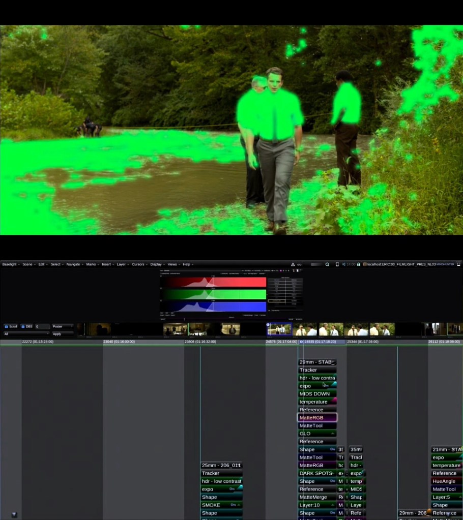 Meanwhile, Fincher and his team had been working with FilmLight‘s Baselight color grading tools and plug-ins since The Curious Case of Benjamin Button, and on the Netflix series, House of Cards. Adding an editorial and visual effects team at his facility in Hollywood, Mindhunter was the first time that the auteur established his own in-house DI. Weidt was brought on to lead color.